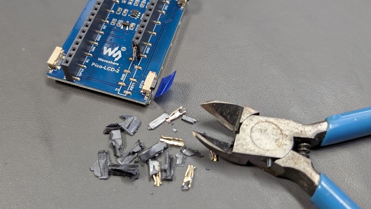 Waveshare のモジュールに使用されているピンソケットは樹脂が結構脆く、 ニッパー等で簡単に割ることができるので、1 ピンずつ破壊していけば 除去することができました。